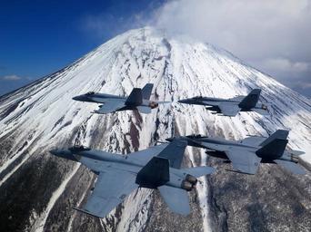 | Keywords: Four F-A-18E Super Hornets flying near Mt. Fuji (150325-N-ZZ999-001).jpg NEAR MT FUJI March 25 2015 Four F/A-18E Super Hornets from the Atsugi Japan-based VFA-27 Royal Maces fly near Mt Fuji The Royal Maces conduct carrier based air strike and strike force escort missions anti-ship operations battle group anti-air operations and surveillance/intellighence collection operations in support of Carrier Air Wing CVW 5 tasking and requirements The squadron is permanently forward-deployed with CVW 5 shore based at Naval Air Facility Atsugi and currently embarked on the Nimitz-class aircraft carrier USS George Washington CVN 73 U S Navy photo by Cmdr Spencer Abbot https //www flickr com/photos/us7thfleet/19306490693/ 150325-N-ZZ999-001 2015-03-25 12 54 Cmdr Spencer Abbot PD-USGov-Military-Navy F/A-18E Super Hornet in flight Strike Fighter Squadron 27 United States Navy Aerial photographs of Mount Fuji Aircraft with Mount Fuji |
