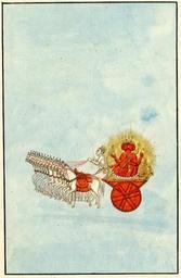 | Keywords: Four headed sun god, Sūrya.jpg en Watercolour painting on paper of the four headed sun god Sūrya The god has orange skin and rides on a chariot pulled by fourteen white horses Each horse has a red saddle The driver of the chariot is shown pale skinned and wearing a crown He holds a whip in his right hand and the reins of the horse in his left Sūrya is seated on a lotus which is placed on the golden seat of the chariot He has four arms his lower left hand holds the mace over his shoulder and his upper left hand holds the lotus flower In his right hand he holds the discus and conch From behind Sūrya emerge numerous golden rays and his chariot is shown flying through the sky The painting is surrounded by a thin black border 19thC early http //www britishmuseum org/research/search_the_collection_database/search_object_details aspx objectid 182886 partid 1 searchText surya fromADBC ad toADBC ad numpages 10 orig 2fresearch 2fsearch_the_collection_database aspx currentPage 3 Company School PD-Art Uploaded with UploadWizard Sun in art |