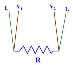 | Keywords: Four point probe.jpg Two wires labeled by V1 and V2 are used for mesuring the voltage drop across the resistor R whereas the two wires labeled by I1 and I2 are for measuring the current through the resistor Own 2007-09-20 WingkLEE Resistor diagrams Resistor symbols |