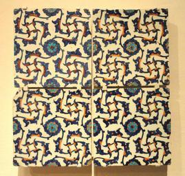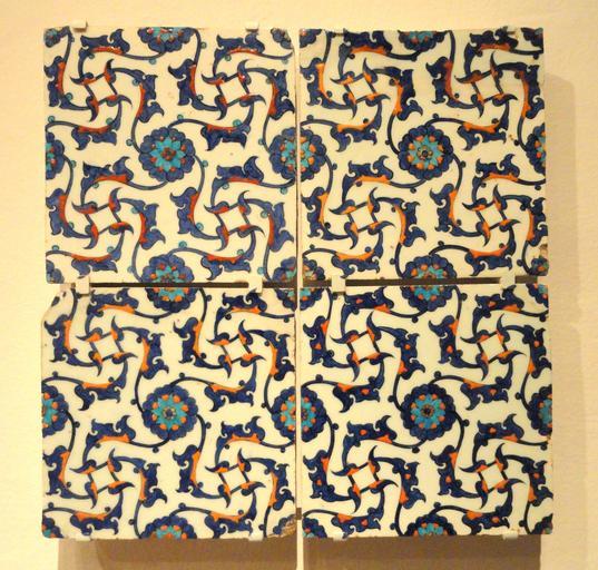 | Keywords: Four Tiles with Arabesque Design, c. 1560, Ottoman dynasty, Iznik, Turkey - Sackler Museum - DSC02547.JPG Iznik tile with interlocking half-palmettes and rosettes Fritware with underglaze decoration Institution Harvard Art Museums Asian and Mediterranean Art Level 2 Room 2550 Art from Islamic Lands Each tile is cm 20 7 20 7 1 8 Daderot 2012-11-17 12 29 02 Identical design to tiles framing the doorway of the Rüstem Pasha Mosque in Istanbul completed c 1563 <br> Similar tiles <br> Harvard Art Museums Inv no http //www harvardartmuseums org/art/216499 1960 23 B<br> Calouste Gulbenkian Museum Lisbon Inv no 1683 Queiro Ribeiro 2009 p 116 fig 65 Denny 2004 p 210 <br> Museum of Islamic Art Qatar File Unknown _Turkey _1560_-_Iznik_Tile_-_Google_Art_Project jpg http //www harvardartmuseums org/art/215764 1985 323 credit line Edwin Binney 3rd by 1985 bequest; to Harvard University Art Museums 1985 cc0 Other versions cc0 Near Eastern pottery in the Sackler Museum İznik ceramics Arabesque art |