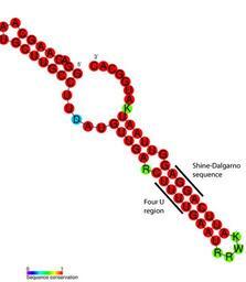 Keywords: FourU.png en Consensus secondary structure of the FourU thermometer ncRNA own Jebus989 diagram Non-coding RNA