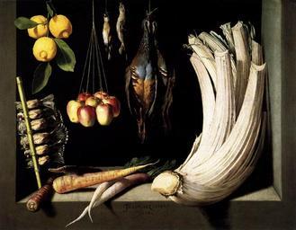 | Keywords: Fra Juan Sánchez Cotán - Still-Life with Game, Vegetable and Fruit - WGA20725.jpg Artwork Creator Fra Juan Sánchez Cotán 1602 Oil on canvas size cm 68 89 Institution Prado object history credit line accession number WGA link 20725 http //www wga hu/art/s/sanchez/cotan/still_li jpg http //www wga hu/html/s/sanchez/cotan/still_li html PD-old-100 painting still-life Spanish 1551-1600 Fray Juan Sánchez Cotán Spanish Baroque paintings in the Museo del Prado Cotan 1602 paintings in Spain Bodegones 17th-century still life paintings in Spain Still life paintings of vegetables Paintings with signatures bottom center 1600s paintings from Spain 1600s still life paintings Baroque still life paintings in Madrid 17th-century still life paintings of fruits Paintings with years of production artist WGA form painting WGA type still-life WGA School Spanish WGA time period 1551-1600 |