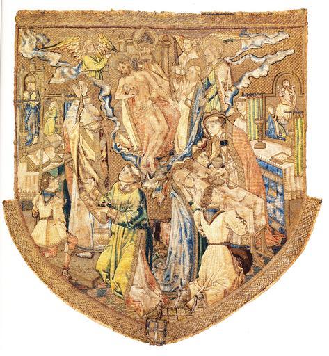 | Keywords: Fragment of a Cope with the Seven Sacraments HMB 308A-B.jpg en Tournai or Southern Netherlands 1463-1478 Embroidery in different techniques gold thread and silk shield shaped hood 55 x 55 cm fragments of orphrey 46 x 32 cm each Historical Museum of Bern Inv 308A-B Provenance Embroidered at the commission of Jacques of Savoy 1450-1486 Count of Romont and presented by him to the Bishop of Lausanne; Lausanne Cathedral Treasury; in 1536 following the Protestant conquest of Lausanne taken to Bern; since 1882 in the possession of the museum 2013-09-24 22 26 10 Campbell Lorne Van der Stock Jan Rogier van der Weyden 1400 “1464 Master of Passions Davidsfonds Leuven 2009 ISBN 978-90-8526-105-6 Tournai embroiderer after Rogier van der Weyden PD-old-100 Uploaded with UploadWizard Ecclesiastical embroidery Paintings by Rogier van der Weyden |