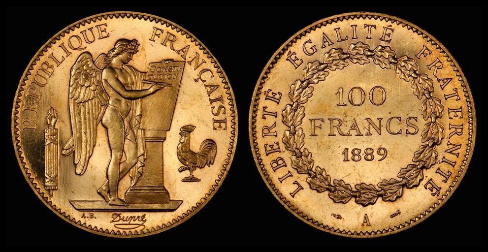 | Keywords: France 1889-A 100 Francs.jpg Republic of France Paris Mint 100 francs gold 1889 Winged genius designed by Augustin Dupré is on the obverse The total mintage for this design in 1889 was only 100 proof coins 1889 coin 2010 image National Numismatic Collection National Museum of American History Paris Mint Republic of France coin National Numismatic Collection image Institution Smithsonian National Museum of American History Use of this image should give credit to the National Numismatic Collection National Museum of American History other versions <gallery caption France winged genius design by Augustin Dupré widths 250px heights 150px perrow 2 > File France 1791-A 30 Sols Louis16 jpg 1791-A 30 Sols File France 1792-A Half Ecu Louis16 jpg 1792-A Half Ecu File France 1793-A 24 Livres jpg 1793-A 24 Livres File France 1889-A 100 Francs jpg 1889-A 100 Francs </gallery> 2013030510011547 Assessments 1 France “ Winged genius on the sol 1791 écu 1792 livre 1793 and franc 1889 Anonymous-EU PD-USGov-SI Money-FR PD-1923 2015 User Godot13 NNC coins uploaded by User Godot13 Uploaded with UploadWizard Gold coins of France French franc 1889 coins Featured Pictures English Wikipedia by User Godot13 NNC coin Featured Pictures English Wikipedia Coins of the French Third Republic |