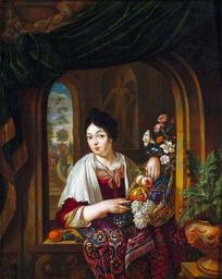 | Keywords: France Fruit seller.jpg France after 1quarter other date century 18 oil walnut wood cm 32 5 26 5 Institution Warsaw Royal Castle Courtier Lodgings accession number ZKW 2087 object history provenanceEvent 1987 purchase Royal Castle in Warsaw P P Desa GdaÅ„sk credit line Fr Mieris signature back Dorota Juszczak Hanna MaÅ‚achowicz 2007 Zamek Królewski w Warszawie malarstwo do 1900 katalog zbiorów Zamek Królewski w Warszawie ISBN 83-70221-68-8 cat no 227 http //kolekcja zamek-krolewski pl/obiekt/id/ZKW_2087 kolekcja zamek-krolewski pl PD-old-100 DEFAULTSORT 1725 before; Fruit seller French paintings in the Royal Castle in Warsaw Females with fruits in art Fruit vendors in art Paintings of baskets Pomona Paintings with brown background People in three-quarter views in art Sleeves Paintings of people in windows in stone wall Ž |