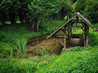 Keywords: france stream creek forest woods trees summer spring hdr bench shelter nature outside country countryside rural