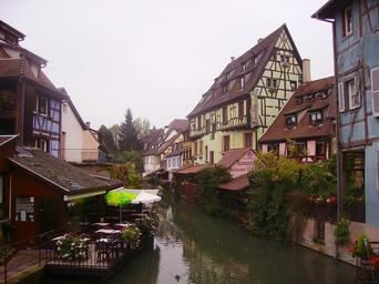 Keywords: france village buildings town architecture sky clouds outside canal river stream water reflections