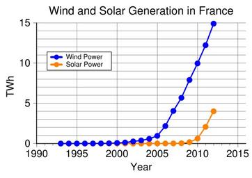 | Keywords: France Wind and Solar Generation.svg translate yes en France wind and solar generation Data from http //www eia gov/cfapps/ipdbproject/IEDIndex3 cfm tid 6 pid 29 aid 12 US EIA 2014-11-07 own Delphi234 Generated with Wikimedia SVG Chart 0 s cc-zero Wind power in France Solar energy in France |
