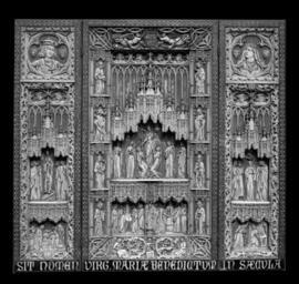 | Keywords: Francisco Pallà s y Puig - Pseudo-Gothic Triptych - Walters 71149.jpg The Glorification of the Virgin occupies the central portion of this triptych She holds the Christ Child on her left arm and is surrounded by six music-making angels Below are two scenes representing the Presentation in the Temple on the left and the Marriage of the Virgin on the right Separating these is a statuette of Saint Peter standing under an architectural canopy The margins are occupied by full-length figures of eight Apostles including Saint Peter shown again at the lower left In the lower margin three angels playing musical instruments are seated amid decorative vinework Each wing of the triptych is divided into three sections The upper portions are occupied by royal portrait busts of Ferdinand and Isabella in quatrefoils identified by their coats of arms Beneath the busts are pairs of narrative scenes On the left the Assumption of the Virgin appears above the Nativity On the right the Annunciation is shown beneath a scene which may represent Christ Taking Leave of His Mother Included within the border of floral tracery surrounding the historiated section of each wing are pairs of Renaissance-style portrait busts set in quatrefoils; the borders of the wings are interrupted at top and bottom by heraldic shields Extending across the base of all three panels is the inlaid ivory inscription SIT NOMEN VIRG MARIAE BENEDICTUM IN SAECULA May the name of the Virgin Mary be blessed through the centuries in a gothic script Located under ornate Gothic canopies the figures are carved in relief on thin narrow bone plaques mounted on wooden supports The figures retain traces of gilding and polychromy and the smooth backgrounds are colored blue Each of the three sections is surrounded by a wooden frame decorated in marquetry of inlaid wood and ivory an Arabic style frequently used in Spain and north Italy during the 14th and 15th centuries This triptych and several similar works have been ascribed to Francisco Pallàs y Puig a Valencian sculptor identified as the 19th-century source for various modern works in the Romanesque and Mozarabic styles Henry Walters generously considered this and two related triptychs Walters 71 150 and 71 151 as compositions in the style of the 15th century rather than intentional forgeries The sculptor has also less charitably been branded a forger between 1890 1899 bone ivory wood Closed cm 60 8 33 10 7 ; Open cm 60 8 66 1 6 6 accession number 71 149 11783 Henry Walters city Baltimore Walters Art Museum Henry Walters Acquired by Henry Walters 1895 Transcription Extending across the base of all three panels in inlaid ivory and gothic script SIT NOMEN VIRG MARIAE BENEDICTUM IN SAECULA; Translation May the name of the Virgin Mary be blessed through the centuries Undercover Stories in Art The Walters Art Gallery Baltimore 1980 place of origin Valencia Spain PD-old-auto 1926 Francisco Pallà s y Puig Media contributed by the Walters Art Museum needs category review Madonna and Child Collections of the Walters Art Museum Media contributed by the Walters Art Museum needs artist update |