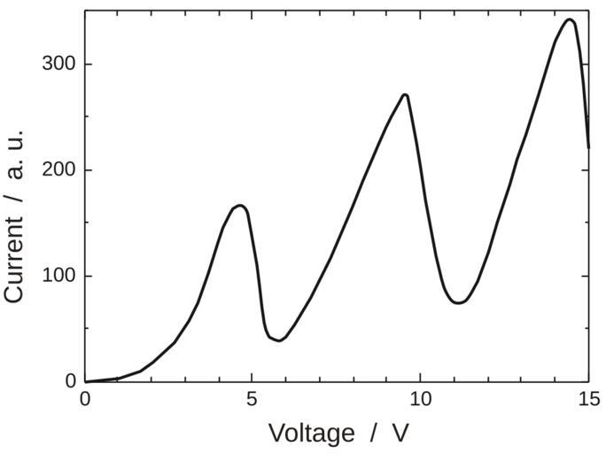 Keywords: Franck-Hertz en.svg Dependence of the anode current upon the voltage in the 1914 Franck-Hertz experiment The tube temperature was about 115 C <ref> cite journal J Franck Hertz G à ber Zusammenstöße zwischen Elektronen und Molekülen des Quecksilberdampfes und die Ionisierungsspannung desselben Verhandlungen der Deutschen Physikalischen Gesellschaft 1914 16 457 “467 A translation of this paper is given in cite book Boorse Henry A Motz Lloyd The World of the Atom 1 46 The Quantum Theory is Tested 766-778 Basic Books 1966 534667 </ref> Wikipedia contributor Ahellwig Redrawing of a figure from the original 1914 paper of Franck and Hertz Measured data points in the original graph have been removed See cite web Auszüge aus der Originalarbeit von Franck und Hertz 1914 http //leifi physik uni-muenchen de/web_ph12/originalarbeiten/franckhertz/original htm http //web archive org/web/20091130224501/http //leifi physik uni-muenchen de/web_ph12/originalarbeiten/franckhertz/original htm 2009-11-30 Franck also used this figure in his Nobel Lecture which is available in English translation at cite book Nobel Lectures Physics 1922-1941 Elsevier Transformation of Kinetic Energy of Free Electrons into Excitation Energy of Atoms by Impacts Franck James 1965 http //www nobelprize org/nobel_prizes/physics/laureates/1925/franck-lecture pdf 2006 reflist Experiment of Franck and Hertz