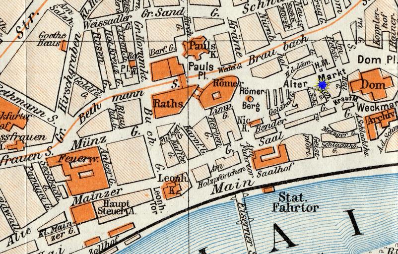 Keywords: Frankfurt Altstadt-Position-Neues Rotes Haus am Markt.jpg en Frankfurt on the Main Position of the Neues Rotes Haus am Markt New Red House at the Market as seen on a map of the old town de Frankfurt am Main Lage des Neuen Roten Hauses am Markt auf einer Karte der Altstadt Meyers Großes Konversations-Lexikon Ein Nachschlagewerk des allgemeinen Wissens Sechste gänzlich neubearbeitete und vermehrte Auflage Bibliographisches Institut Leipzig und Wien 1902 “10 Bibliographisches Institut 1904 PD-old Neues Rotes Haus am Markt Frankfurt am Main Maps from Meyers Konversationslexikon Bibliographisches Institut |