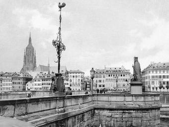 | Keywords: Frankfurt Am Main-Fay-BADAFAMNDN-Heft 26-Nr 303-1911-Bruecke mit dem Denkmal Kaiser Karl des Grossen.jpg Follows de Heft 26 Tafel 303 / Titel auf der Tafel Brücke mit dem Denkmal Kaiser Karl des Grossen / Originalbeschreibung Zu den Denkmälern der alten Reichsstadt die durch Geschichte und Sage verklärt bestimmt sind für ewige Zeiten im Gedächtnis der Menschen fortzuleben gehört die žrote Mainbrücke Aus Mainsandstein errichtet auf massiven Pfeilern mit kräftigen Vorder- und Hinterköpfen die zwischen dem 5 und 7 Bogen eine architektonisch recht wirksame Ausbuchtung erfahren haben überspannt sie in halbkreisförmigen Bogen aus Quaderschichten den ruhig dahinströmenden Flusslauf Ueber das Alter sind wir nur schlecht unterrichtet Die erste urkundliche Erwähnung der alten Brücke geschieht im Jahre 1222 doch ist mit Sicherheit anzunehmen dass die Erbauung einer Holzbrücke in weit frühere Zeit hinaufreicht Mau kann sich kaum vorstellen dass die ansehnliche Niederlassung um den žSaalhoeff das alte Palatium Ludwigs des Frommen nicht schon sehr bald mit den ausgedehnten Wohnsitzen der Ministerialen in der Sachsenhäuser Gemarkung in direkter Verbindung gestanden hat Allein die Unsolidität des Materials und die rohe Naturgewalt worunter die Menschheit des Mittelalters in ganz anderer Weise zu leiden hatte als wir in unseren Tagen zwangen zu dem kostspieligen Ersatzbau in Stein Doch brachten Mangel an Mittel wie auch die Schwierigkeit geeignete Arbeitskräfte zu finden das monumentale Werk nur langsam voran Man fundierte die Pfeiler unmittelbar mit Hülfe von eichenen Schwellenrosten auf die Flusssohle die nicht etwa wie irrtümlich angenommen wird aus Tonschiefer sondern aus blauem Cyrenenmergel besteht der bei der verstärkten Strömung zwischen den Pfeilern den wachsenden Auskalkungen der Sohle nicht genügenden Widerstand entgegensetzt So wird denn im Laufe des 13 und 14 Jahrhunderts wiederholt von ausgeführten Steinarbeiten an Pfeilern und Schwibbogen berichtet Auch für König Heinrich den Sohn Friedrichs II bildete die Erhaltung der Brücke im Interesse des Reiches einen Gegenstand schwerer Sorge Der aus politischen Gründen vor allem den Städten wohlgesinnte junge Fürst verlieh im Jahre 1235 ein Privilegium zur halben Nutzung der Münze und zum Bezug des zur Reparatur der Brücke nötigen Holzes aus dem Reichswalde Auf das höchste bedroht muss aber die Erhaltung der Brücke um das Jahr 1300 gewesen sein Anders hat es keinen Sinn dass fünfzehn italienische Bischöfe einen Ablass für jene Gläubigen gewähren die zum Bau der vom Hochwasser zerstörten Pfeiler beitrugen Die Brückenbahn bestand zu jener Zeit zum grössten Teil aus Holz und gab dem Bauwerk noch nicht durch die eigene Schwere der gewaltigen Schwibbogen eine Stabilität die allen Unbilden der Witterung bis zum heutigen Tage getrotzt und entgegen den gemachten Einwänden auch für absehbare Zukunft noch trotzen würde Immerhin mag die Brücke im Jahre 1405 wie die Abbildung von dem Schreiber eines Bedebuches zeigt das heutige Aussehen gehabt haben Wenn dennoch aus dem Jahre 1419 berichtet wird dass man an dem letzten Pfeiler gearbeitet habe damit mam fernerhin ždes kostlichen buwes mit holczwercken nit bedarff sondern balken druber leget und druff brückendele so handelt es sich hier um die Beseitigung eines Zustandes den man im Hinblick auf unruhige Zeiten belassen hatte um gegebenen Falles ohne weitere Schwierigkeiten die Verbindung der beiden Flussufer aufzuheben Einen gewissen Schutz gewährte immer noch der über zwei Oeffnungen belassene Brückenbelag aus Bohlen der erst Ende des 16 Jahrhunderts durch Bogen am Sandstein ersetzt wurde Und böse Zeiten zogen für das ehrwürdige Denkmal herauf Im Jahre 1427 sah sich der Rat der freien Reichsstadt genötigt aus Furcht vor den wilden Horden der Hussiten die Bogen der Brücke mit schweren Balken versperren zu lassen Den Einspruch des in seinen Fluss- und Hoheitsrechten sich beschränkt glaubenden Erzbischhofs von Mainz nahm man leicht Etwa 100 Jahre später aber während der Bewegung des Bauernaufstandes der auch in das Maintal hinüber gegriffen hatte pflanzte die ärmere Bevölkerung der Stadt die Fahne der Empörung auf der Brücke auf ohne dass es jedoch zu ernsthafteren Zusammenstössen gekommen war Schlimmer erging es dem Bauwerk im schmalkaldischen Kriege Als das Protestantenheer zur Belagerung der damals in kaiserlichem Besitz sich befindenden Reichsstadt schritt hatte man alle Vorkehrungen zum Schutze des unentbehrlichen Verkehrsweges getroffen Grosse Leinentücher waren auf der Brücke gespannt und die Mühle selbst mit grossen Wollsäcken verstopft um sie während der Zeit der Bedrängnisse in Gang zu halten Der Hauptanschlag zur Zerstörung der Brücke vermittels schweren Geschützes vereitelte der Abschluss des Passauer Vertrages und der damit verbundene Abzug eines Teiles der Belagerungstruppen Kaum weniger ernst war die Lage der Brücke im dreissigjährigen Kriege Auf der Fahrbahn selbst kam es zu heftigem Kampfe und es muss als ein Wunder angesehen werden dass bei dem Geschützfeuer von Ufer zu Ufer wobei 26 Häuser in Asche gelegt wurden die Brücke selbst kaum wesentlichen Schaden erlitt Allein an dem Kruzifix seien wie die Ueberlieferung will noch heute die Spuren von Schwedenkugeln sichtbar Im siebenjährigen Kriege wie im Befreiungskriege hat ein günstiger Stern über der Stadt gewaltet und grössere Verluste ferngehalten Im Sturmjahre 1848 sah die Brücke die letzten kriegerischen Ereignisse die aber Spuren irgendwelcher Art an dem Denkmal nicht hinterlassen haben <br>Wie in Kriegszeiten so stand auch in den Jahren des Friedens die alte Mainbrücke im Mittelpunkt des Interessens der Bewohner Ein gewaltiger Menschenstrom zog jahraus jahrein auf uralten Handelswegen über die Brücke die zur Lebensader des Rhein- und Main-Gaues geworden war Durch besondere Gesetze geschützt bedrohte man einen jeden der auf der Brücke Stre