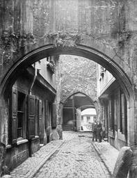 | Keywords: Frankfurt Am Main-Fay-BADAFAMNDN-Heft 09-Nr 103-1902-Thorweg Neugasse Rebstock.jpg Artwork Creator Carl Friedrich Fay Gateway New Lane Rebstock According to Battonn the New Lane was a dead end in former times according to Baldemar named Erkingbold's Lane and locked off from the Chicken Market As its present-day name implies the Lane was undertaken in later times Beyond the House žGolden Cross No 2 from here a gateway leads to the Court Rebstock after the gateway with a dwelling to the right and the left comes a second arch which after a third arch finally opens out into the Rebstock Since when this passage is open-ended remains undetermined A recent March of 1902 court hearing determined the passage from the Market trough the Rebstock to the Jug Lane usually open to public traffic as undoubted public property According to a bill of sale from 1860 the Rebstock itself was a common property of all its residents Die Neugasse war nach Batton früher eine Stumpfgasse die nach Baldemar vor Zeiten Erkingboldgasse hiess und bei dem Hühnermarkt geschlossen war Wie ihr heutiger Namen andeutet ist sie eine erst später durchgeführte Gasse Von ihr aus geht bei dem Hause žGoldenes Kreuz No 2 ein Thorweg nach dem Hofe Rebstock hinter diesem Thorweg kommt nach je einer Behausung rechts und links ein zweiter Mauerbogen von dem man dann wieder aus einem dritten Bogen erst in den Rebstock gelangt Seit wann dieser Weg offen ist bleibt unbestimmt Bei einer jüngst im März 1902 stattgehabten Verhandlung vor der Strafkammer wurde die herkömmlich zum öffentlichen Verkehr freigegebene Passage durch den Rebstock vom Markte aus bis zur Kruggasse als zweifellos öffentliches Eigenthum anerkannt Der Rebstock selbst war nach einem von 1860 stammenden Kaufbrief allen Adjazenten gemeinsam ca 1902 technique collotype dry plate size cm 20 7 15 89 unknown Private collection Mylius Frankfurt am Main object history credit line en Issue 09 Table 103 de Heft 09 Tafel 103 accession number Carl Friedrich Fay Carl Friedrich Mylius Franz Rittweger Fritz Rupp Bilder aus dem alten Frankfurt am Main Nach der Natur Verlag von Carl Friedrich Fay Frankfurt am Main 1896 “1911 PD-old Bilder aus dem alten Frankfurt am Main Nach der Natur Hof Rebstock am Markt 1902 in Frankfurt am Main |