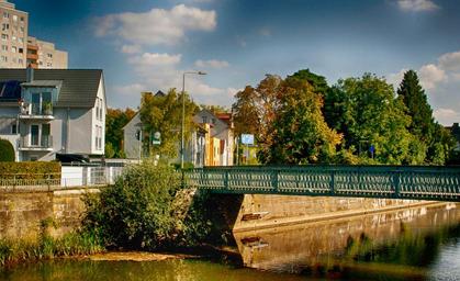 Keywords: frankfurt-hausen germany bridge canal river water reflections hdr sky clouds buildings city cities urban architecture fall autumn