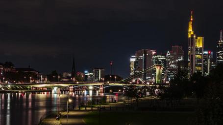 Keywords: frankfurt main river night city city night skyline architecture metropolis city at night river landscape water bridge reflection cityscape