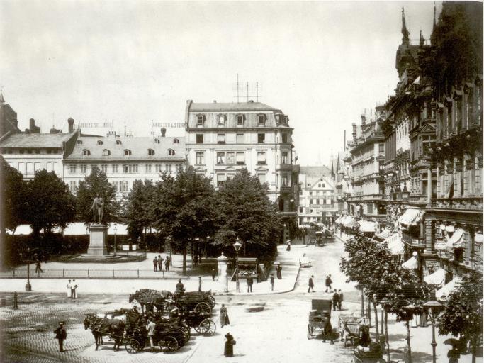 | Keywords: Frankfurt Pariser Hof.jpg Frankfurt am Main Germany Der Gasthof / Hotel Pariser Hof am Schillerplatz heute An der Hauptwache vor 1898 Hier stieg 1784 der damals 25jährige Dichter Friedrich Schiller 1759-1805 anlässlich einer Aufführung seines Stückes Kabale und Liebe ab Damals nannte sich der Gasthof noch ZUM SCHWARZEN BOCK 1809 wurde der Gasthof von den Architekten Beck und Grünwald klassizistisch umgebaut und nannte sich fortan Hotel à la ville de Paris später Hotel de Paris Am 9 Mai 1864 dem 59 Todestag Schillers wurde das 8 m hohe Schiller-Denkmal des Johann Dielmann 1819-1886 enthüllt der 4 m hohe Schiller aus Bronze steht mit dem Rücken vor dem Gebäude 1865 erhielt der Platz nach einer Umgestaltung ihm zu Ehren den Namen Schillerplatz statt Paradeplatz 1938 musste er auf den nahen Rathenauplatz damals Hort-Wessel-Platz wegen der vielen neuen Straßenbahnen umziehen Zu seinem 150 Todestag erfolgte 1955 dann ein erneuter Umzug in die Taunusanlage <br> Photographie von Karl Hertel Stadtarchiv Frankfurt PD-old An der Hauptwache Friedrich Schiller |