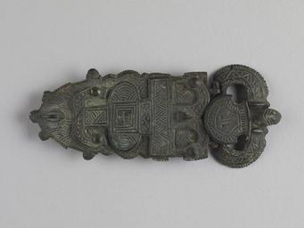 | Keywords: Frankish - Belt Buckle - Walters 542347.jpg This highly decorative buckle is unusual in that it is made of two pieces riveted together It is decorated with incised and punched patterns and features a cross at the center The tongue has a schematic human face and an animal head terminal Such animal head terminals are common on Migration period jewelry century 7 Early Medieval bronze cm 5 5 13 7 1 accession number 54 2347 34764 Joseph Brummer New York Joseph Brummer Sale Parke-Bernet Galleries New York May 12 1949 no 278 Walters Art Museum 1949 by purchase Museum purchase 1949 Early Christian and Byzantine Art Baltimore Museum of Art Baltimore 1947 Jewelry - Ancient to Modern The Walters Art Gallery Baltimore 1979-1980 place of origin Burgundy France Walters Art Museum license Medieval metalwork in the Walters Art Museum Merovingian belt buckles Media contributed by the Walters Art Museum needs category review |