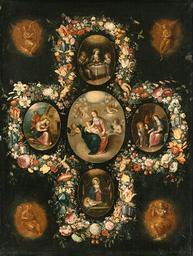 | Keywords: Frans Francken II & Workshop of Frans Francken II - The Virgin and Child with Scenes from the Life of Christ.jpg Artwork Creator Frans Francken II and Workshop of Frans Francken II en The Virgin and Child with Scenes from the Life of Christ in painted ovals surrounded by a Garland of Flowers with music-making Angels en brunaille 1615-1630 http //www christies com/lotfinder/lot/andries-daniels-and-frans-francken-ii-1428907-details aspx from searchresults pos 5 intObjectID 1428907 sid 17405631-b049-4f87-8afb-16bb88d5a849 page 1 lid 1 Oil canvas cm 126 4 95 2 Sold at Christie's 29 January 1999 New York lot 131 as Andries Daniels and Frans Francken II but the https //rkd nl/explore/images/59014 attribution to Andries Daniels is rejected by the RKD who attributes this work to Frans Francken II and workshop of Frans Francken II Other versions PD-old-100 Religious paintings by Frans Francken II Paintings of Madonna and Child Still-life paintings by Frans Francken II Garland of flowers frame in paintings |