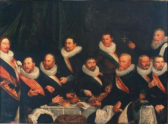 | Keywords: Frans Pietersz de Grebber - Maaltijd van officieren van de St. Jorisdoelen 1621-1624.jpg en Officers' banquet of the St George Civic Guard in 1624 Haarlem From left to right Jacob Schout flag bearer Augustyn Steyn Colonel with orange sash Pieter Adriaensz Verbeek provoost Johan de Waal Captain standing Johan van de Camer Captain Thomas Schatter Lieutenant standing Barthelomeus Veer Captain sitting in the foreground servant standing and holding a glass of wine on a platter Dirck Cornelisz Koeckebacker Lieutenant and Willem Buys Lieutenant nl Maaltijd van officieren van de St Jorisdoelen 1621-1624 1624 oil on canvas 166 x 225 5 cm Institution Frans Halsmuseum Haarlem accession number OS-I-100 http //www geheugenvannederland nl/ /nl/items/FHM01 OS-I-100 Geheugen van Nederland Creator Frans Pietersz de Grebber PD-Art-100 Uploaded with UploadWizard 1624 paintings Frans Pietersz de Grebber St Jorisschutterij Haarlem Haarlem damast in art Paintings in the Frans Hals Museum ImageNote 1 3 248 151 undefined 1140 842 2 Jacob Cornelisz Schout ImageNoteEnd 1 ImageNote 2 157 375 127 undefined 1140 842 2 Augustyn Steyn ImageNoteEnd 2 ImageNote 3 285 356 134 undefined 1140 842 2 Pieter Adriensz Verbeeck ImageNoteEnd 3 ImageNote 4 409 237 140 undefined 1140 842 2 Johan de Wael ImageNoteEnd 4 ImageNote 5 549 376 147 undefined 1140 842 2 Johan van de Camer ImageNoteEnd 5 ImageNote 6 648 225 161 undefined 1140 842 2 Thomas Schatter ImageNoteEnd 6 ImageNote 7 722 363 205 undefined 1140 842 2 Barthelomeus Veer ImageNoteEnd 7 ImageNote 8 932 368 104 undefined 1140 842 2 Dirck Cornelisz Koeckebacker ImageNoteEnd 8 ImageNote 9 1043 370 95 undefined 1140 842 2 Willem Buys ImageNoteEnd 9 ImageNote 10 982 201 155 undefined 1140 842 2 servant ImageNoteEnd 10 Schuttersmaaltijd |