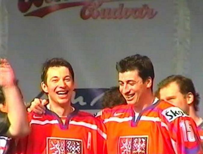 | Keywords: František Kaberle and Tomáš Kaberle.JPG  Čeští hokejisté František Kaberle vlevo a jeho bratr Tomáš Kaberle Czech ice hockey players František Kaberle left and his brother Tomáš Kaberle own - frame capture from homemade video Jarba 2005-05-15 Tomáš Kaberle Arrival of the Czech national ice hockey team Old Town Square 15 May 2005 František Kaberle |