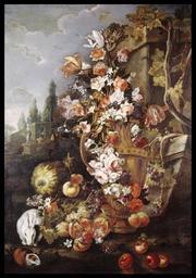 | Keywords: Franz Werner von Tamm - Still Life of Flowers and Fruits in a Garden - Walters 371674.jpg A deceptively casual cascade of sweet-smelling roses tulips and other cultivated flowers combined with luscious ripe fruit including a melon grapes and a pomegranate sliced open is set before a classicizing urn in an aristocratic garden accompanied by a rabbit and guinea pig The owner of a palatial home in Rome or northern Europe around 1700 would appreciate this still life as a frank celebration of abundance fertility and the satisfaction of indulging the senses that would bring cheer to the walls even in the depths of January Tamm worked for princely collectors in Rome and Vienna where a similar composition was commissioned in 1707 by the prince of Liechtenstein for his palace there Such large decorative paintings were commonly hung in massed groupings like the present one The dark rich style owes much to Neapolitan still-life painters whose work was popular in Rome Indeed this painting and its companion Walters 37 1673 have also been attributed to the Neapolitan Nicola Malinconico 1663-1721 Zeri Italian paintings in the Walters Art Gallery 349 470-471 between 1700 1710 Baroque Oil on canvas Painted surface cm 171 5 123 5 accession number 37 1674 33606 Don Marcello Massarenti Collection Rome date and mode of acquisition unknown 1897 catalogue no 446 as Mario dei Fiori Henry Walters city Baltimore Walters Art Museum Henry Walters Acquired by Henry Walters with the Massarenti Collection 1902 World of Wonder The Walters Art Gallery Baltimore 1971-1972 place of origin Vienna Austria Walters Art Museum license 2D Baroque paintings in the Walters Art Museum Franz Werner von Tamm Media contributed by the Walters Art Museum needs category review Media contributed by the Walters Art Museum needs artist update |