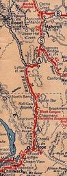 | Keywords: map Detail of Shell Oil Co. Official Road Map of British Columbia, The H.M. Gousha Co., 1939. The Fraser Canyon Highway portion of the Cariboo Road ran from Hope to Lytton along the Fraser Canyon alongside the Canadian Pacific and Canadian National Railway lines. During this period, the highway was designated as B.C. Highway 'A'. In 1941, the road was re-assigned as B.C. Highway No. 1. Serious reconstruction of the old Cariboo Wagon Road for automobile use began by the Public Works Department in 1924-25. With the completion of the (second) Alexandra Suspension Bridge in 1926, the highway once again became passable to Lytton and beyond. In the years prior to the opening of the bridge, motor vehicles were suggested to "entrain" at Hope Station (Haig) with the CPR to Spences Bridge to travel to destinations in the Interior. To travel north beyond Yale from 1926 to 1947, motorists had to pay a toll which paid for the suspension bridge. In 1950, major improvements were proposed in accordance to the Trans-Canada Highway Agreement to bring the road to a national highway standard. Ambitious construction projects included a series of tunnels (constructed 1957-64), hillside reinforcements and bridges including the New Alexandra Bridge (1962). With the official opening dedications at Rogers Pass in the summer of 1962, the scenic road became part of the Trans-Canada Highway and a tourist attraction in its own right. Aside from the canyon itself, attractions included the Hell's Gate Fishway (completed 1946) and Airtram (opened 1971) and the North Bend Aerial Ferry (operated 1940-85). The current, modern tunnels are, from south to north: Yale (completed 1963), Saddle Rock (1958), Sailor Bar (1959), Alexandra (1964), Hell's Gate (1960), Ferrabee (1964) and China Bar (1961). With the opening of the Coquihalla Hightway (Hwy. 5) in 1986, the Fraser Canyon Highway ceased to be the primary route utilized by commercial and tourist drivers and has taken on a less hectic traffic pace. (And more so since the removal of the toll fees on the Coquihalla Highway since September 2008.) Detail of Shell Oil Co. Official Road Map of British Columbia, The H.M. Gousha Co., 1939. The Fraser Canyon Highway portion of the Cariboo Road ran from Hope to Lytton along the Fraser Canyon alongside the Canadian Pacific and Canadian National Railway lines. During this period, the highway was designated as B.C. Highway 'A'. In 1941, the road was re-assigned as B.C. Highway No. 1. Serious reconstruction of the old Cariboo Wagon Road for automobile use began by the Public Works Department in 1924-25. With the completion of the (second) Alexandra Suspension Bridge in 1926, the highway once again became passable to Lytton and beyond. In the years prior to the opening of the bridge, motor vehicles were suggested to "entrain" at Hope Station (Haig) with the CPR to Spences Bridge to travel to destinations in the Interior. To travel north beyond Yale from 1926 to 1947, motorists had to pay a toll which paid for the suspension bridge. In 1950, major improvements were proposed in accordance to the Trans-Canada Highway Agreement to bring the road to a national highway standard. Ambitious construction projects included a series of tunnels (constructed 1957-64), hillside reinforcements and bridges including the New Alexandra Bridge (1962). With the official opening dedications at Rogers Pass in the summer of 1962, the scenic road became part of the Trans-Canada Highway and a tourist attraction in its own right. Aside from the canyon itself, attractions included the Hell's Gate Fishway (completed 1946) and Airtram (opened 1971) and the North Bend Aerial Ferry (operated 1940-85). The current, modern tunnels are, from south to north: Yale (completed 1963), Saddle Rock (1958), Sailor Bar (1959), Alexandra (1964), Hell's Gate (1960), Ferrabee (1964) and China Bar (1961). With the opening of the Coquihalla Hightway (Hwy. 5) in 1986, the Fraser Canyon Highway ceased to be the primary route utilized by commercial and tourist drivers and has taken on a less hectic traffic pace. (And more so since the removal of the toll fees on the Coquihalla Highway since September 2008.) |
