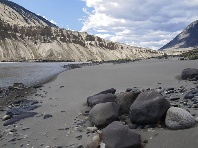 Keywords: fraser river shoreline sand stone pebbles mountain valley river water hoodoos british columbia canada hot dry