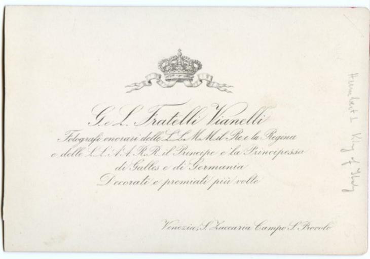 | Keywords: Fratelli Vianelli (Giuseppe e Luigi, flor. 1860-1890 ca) - VE - Umberto I di Savoia 2.jpg Retro dell'immagine Fratelli Vianelli Venezia Re Umberto I of Italy con il marchio dell'azienda Back of the picture Fratelli Vianelli Venice King Umberto I di Savoia diplaying the trademark <gallery> File Fratelli Vianelli Giuseppe e Luigi flor 1860-1890 ca - VE - Umberto I di Savoia 1 jpg Recto File Fratelli Vianelli Giuseppe e Luigi flor 1860-1890 ca - VE - Umberto I di Savoia 2 jpg Verso </gallery> scan Forse durante la visita dei Reali a Venezia il 20 luglio 1882 Studio Giuseppe e Luigi Vianelli floruerunt 1860-1890 ca PD-old Fratelli Vianelli Trademark 1882 Umberto I of Italy 1882 1882 Trademarks of early photographers Vianelli 1882 |