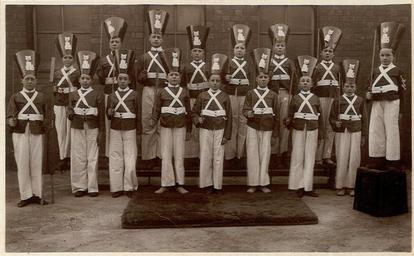 | Keywords: Fred C Palmer boy tin soldiers.jpg Postcard group portrait of boys dressed as tin soldiers at or near Swindon Wiltshire England 1920s or 30s The photographer was Fred C Palmer of Tower Studio Herne Bay Kent ca 1905-1916 and of 6 Cromwell Street Swindon ca 1920-1936 He is believed to have died 1936-1939 ;Points of interest The location is possibly outside a school because a school form and coconut mat are in use both used in school gymnastics at that time The windows appear to be frosted The boy on the left is holding a rolled-up banner and two of the cat-cutouts have gone awry Could this be part of a Puss-in-Boots pantomime or a themed parade The boys have possibly been told to look tough but the boy in the back row on the left is smiling Editing This is a scan of an historical image which has darkened with age Adjusting contrast would cause loss of detail in dark or light areas It is suggested that edited versions of this image be uploaded as separate files Thank you Border The remaining border of this image is important for researchers of this photographer Some photographers trimmed their images more than others and Palmer has a reputation for producing smaller postcards than other early 20th century UK photographers He took his own photos developed them in-house onto postcard-backed photographic paper and trimmed them himself It is worth adding that during hand-developing the border is actively masked with equipment which both crops the picture and causes the white frame or border to appear on the paper This frame is part of the design and is one of the reasons why the quality of Palmer's work is so interesting and why there is an article and category for him on English Wiki Researchers need to see exactly where the edge of the postcard is Thank you for taking the time to read this http //www flickr com/photos/swindonlocal/5707416086/in/photostream s 1920 or 30s Fred C Palmer died 1936-1939 out of copyright PD-art-70 Fred C Palmer of Swindon History of Swindon People of Swindon Portraits of children at full length Group photographs of children |