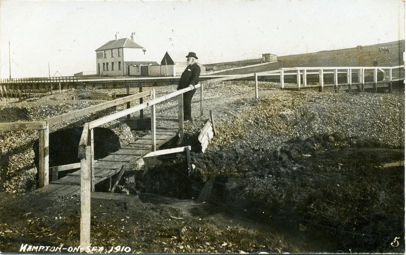 Keywords: Fred C Palmer Edmund Reid on his bridge.jpg Postcard of Hampton-on-Sea Herne Bay Kent England dated 1910 showing Edmund Reid the police detective who investigated the Whitechapel murders Reid is standing on the bridge that he and a neighbour built over Westbrook; the council promptly said it was unsafe and demolished it In the background is the Hampton Inn on Hampton Pier Avenue ;Points of interest The cliff edge fronting Hampton-on-Sea has not yet eroded as far back as it is today Reid has put on his best clothes for the photograph The bridge cannot have existed for more than a few days or weeks so Palmer was possibly called in for the photograph almost immediately after it was built Next to the Hampton Inn animals graze where now there are houses The hut at the end of the pub garden is probably the lavatory block The postcard may have once been tinted but if so the colour has almost completely faded Scan of postcard circa 1910 Palmer took similar pictures of the same site in that year Fred C Palmer d 1941 out of copyright Other views of the same subject are File Hampton-on-Sea 1910 023 jpg and File Hampton on Sea 1911 125 jpg PD-art Erosion in the United Kingdom Disasters Buildings in Kent Edmund Reid