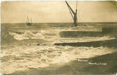 | Keywords: Fred C Palmer grounded barge Herne Bay.jpg Postcard photo of rough sea at Herne Bay Kent England It shows a grounded barge near the beach and a ketch heading out to sea and the title on the photo is 'Rescued' Herne Bay Aug 08 The photographer was Fred C Palmer of Tower Studio Herne Bay Kent who is believed to have died 1936-1939 There is no border on this photograph The stamp and postmark have been removed from the reverse but the letter on the back was apparently written in the same year Ethel writes to her mother Mrs Green in Bournemouth Hampshire saying Will write you a letter in the morning and tell you all about this wreck It was anchored just outside our shop It's awfully rough again today Scan of original postcard in my possession 1908-08 Fred C Palmer died 1936-1939 out of copyright PD-old-70-1923 Fred C Palmer of Herne Bay Barges of the United Kingdom Seascapes of the United Kingdom |