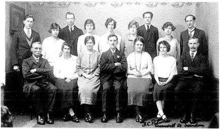 | Keywords: Fred C Palmer Swindon portrait 037.jpg 1930s postcard photo of Sunday school teachers at Church of Christ Broad Street Swindon Wiltshire England The photographer was Fred C Palmer of Tower Studio Herne Bay Kent ca 1905-1916 and of 6 Cromwell Street Swindon ca 1920-1936 He is believed to have died 1936-1939 ;Points of interest Palmer has arranged the group so carefully by height and sex for a visually balanced image Palmer's technique for deciding the moment for taking the photograph appears to be concentrated always on one group member It is possible that he waited for that person's face to take an ideal pose or he instructed them to move into a classic portrait position The example here is the elderly gentleman at front left a classic portrait of an individual in itself Editing The remaining border of the first upload of this image is important for researchers of this photographer Some photographers trimmed their images more than others and Palmer has a reputation for producing smaller postcards than other early 20th century UK photographers He took his own photos developed them in-house onto postcard-backed photographic paper and trimmed them himself It is worth adding that during hand-developing the border is actively masked with equipment which both crops the picture and causes the white frame or border to appear on the paper This frame is part of the design and is one of the reasons why the quality of Palmer's work is so interesting and why there is an article and category for him on English Wiki Researchers need to see exactly where the edge of the postcard is Thank you for taking the time to read this http //www flickr com/photos/swindonlocal/5780239517/ s 1930 Fred C Palmer died 1936-1939 out of copyright PD-art-70 Fred C Palmer of Swindon Group portraits with 16 persons 20th-century group portrait photographs Group portraits in 2 rows |
