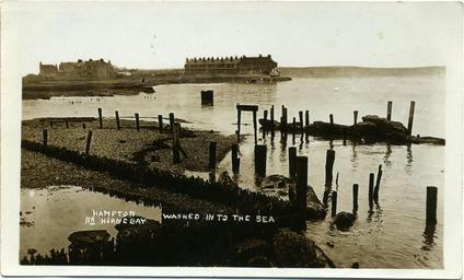 | Keywords: FredCPalmerDisappearingHampton-on-Sea012.jpg Postcard dated around 1910 showing the front of Hernecliffe Gardens terrace at centre top of image in the process of sea erosion At left top of image is Hampton Farm House one of the last buildings to be demolished in the 1920s Photographed from Hampton Pier possibly from the end of the demolished old pier Border The remaining border of this image is important for researchers of this photographer Some photographers trimmed their images more than others and Palmer has a reputation for producing smaller postcards than other early 20th century UK photographers He took his own photos developed them in-house onto postcard-backed photographic paper and trimmed them himself It is worth adding that during hand-developing the border is actively masked with equipment which both crops the picture and causes the white frame or border to appear on the paper This frame is part of the design and is one of the reasons why the quality of Palmer's work is so interesting and why there is an article and category for him on English Wiki Researchers need to see exactly where the edge of the postcard is This postcard has no white frame but the edge of the card is the edge of the composition Thank you for taking the time to read this ;Points of interest The stumps in the water in the foreground are the remains of old Hampton pier and of structures built by the Oyster Fisheries in the 19th century Photographs of Hampton Farm House are rare The sky has been overpainted clumsily; this is not typical of Palmer's work although it does possibly improve the composition Scan of postcard circa 1910 Fred C Palmer d 1941 out of copyright Other views of the same subject are File Hampton-on-Sea 1910 023 jpg and File Hampton on Sea 1911 125 jpg PD-old-70-1923 Hampton-on-Sea Erosion in the United Kingdom Disasters Buildings in Kent Fred C Palmer of Herne Bay |
