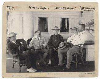 | Keywords: smithsonian institution smithsonianinstitution frederick remington frederickremington remington sculptor stephen bonsal stephenbonsal r.h. davis rhdavis caspar whitney casparwhitney porch wicker chair wickerchair hats moustache 1890 late 19th century late19thcentury group portrait western sculpture westernsculpture old photo oldphoto conversation archives of american art archivesofamericanart Description: Remington seated on a porch, smoking a pipe. Identification on front (handwritten): Davis, R.H.; Bonsal, Stephen; Whitney, Caspar; Remington, Frederic. Creator/Photographer: Unidentified photographer Medium: Black and white photographic print Dimensions: 12 cm x 17 cm Date: 1890 Collection: Charles Scribner's Sons Art Reference Department Records, c. 1865-1957 Persistent URL: www.aaa.si.edu/collections/images/detail/rh-davis-stephen... Repository: Archives of American Art Accession number: aaa_charscrs_4341 Description: Remington seated on a porch, smoking a pipe. Identification on front (handwritten): Davis, R.H.; Bonsal, Stephen; Whitney, Caspar; Remington, Frederic. Creator/Photographer: Unidentified photographer Medium: Black and white photographic print Dimensions: 12 cm x 17 cm Date: 1890 Collection: Charles Scribner's Sons Art Reference Department Records, c. 1865-1957 Persistent URL: www.aaa.si.edu/collections/images/detail/rh-davis-stephen... Repository: Archives of American Art Accession number: aaa_charscrs_4341 |