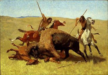 | Keywords: Frederic Remington - The Buffalo Hunt.jpg Artwork Creator Frederic Remington 1890 oil canvas in 34 49 Institution Buffalo Bill Historical Center Whitney Gallery of Western Art Collection object history credit line Gift of William E Weiss accession number 23 62 http //old bbhc org/collections/bbhc/WG_ObjectPage cfm museum WG VarObjectKey 54934 Whitney Gallery of Western Art Collection PD-old-100-1923 1909 Paintings of Native Americans by Frederic Remington Paintings in the Buffalo Bill Historical Center Bisons in art 1890 paintings Paintings of hunting men on horseback |