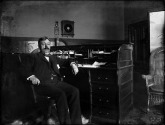 | Keywords: field columbian museum chicago blackandwhite monochrome indoor black and white Frederick J.V. Skiff in his office. He is seated on a chair, his arm is resting on the wood roll-top desk which is filled with compartments holding papers and correspondence. Under the chair appears to be an animal skin rug. Wicker arm chair to the right. A telephone or intercom device is mounted on the wall above him. Field Columbian Museum. 1895. Original size and material: 8x10 inch glass negative Digital Identifier: CSGN8407 Part of the Illinois Urban Landscapes Project: www.fieldmuseum.org/urbanlandscapes/ Frederick J.V. Skiff in his office. He is seated on a chair, his arm is resting on the wood roll-top desk which is filled with compartments holding papers and correspondence. Under the chair appears to be an animal skin rug. Wicker arm chair to the right. A telephone or intercom device is mounted on the wall above him. Field Columbian Museum. 1895. Original size and material: 8x10 inch glass negative Digital Identifier: CSGN8407 Part of the Illinois Urban Landscapes Project: www.fieldmuseum.org/urbanlandscapes/ |