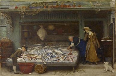 | Keywords: Frederick Walker - A Fishmonger's Shop - Walters 37943.jpg In this watercolor a fishmonger offers his stock to a female customer who appears to hesitate before choosing among the many types of fish on display Mullet mackerel skate cod sea bass herring salmon and gurnard sea robin can all be identified in the display A flounder and a puffer fish hang from the shop front above In the foreground a child with a hoop gazes into a tub probably filled with live carp Given the variety of seafood on display it is not surprising to learn that the artist was an enthusiastic fisherman A version of this work was exhibited to great acclaim at the Old Watercolour Society in London 1873 watercolor paper cm 20 2 30 3 accession number 37 943 32788 William T or Henry Walters Baltimore date and mode of acquisition unknown Walters Art Museum Henry Walters Acquired by William T or Henry Walters A Connoisseur's Portfolio place of origin Walters Art Museum license 2D A Connoisseur's Portfolio Frederick Walker Paintings in the Walters Art Museum Media contributed by the Walters Art Museum needs category review Fish in art |