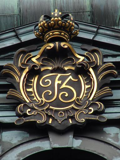 Keywords: Frederik Vs monogram (St. Petri Kirke).JPG Kong Frederik V af Danmark og Norges monogram restaureret på Sankt Petri Kirkes tårn København own 2012-09 Orf3us Sankt Petri Kirke Royal monogram of Frederick V of Denmark
