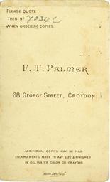 | Keywords: FredTPalmer005a.jpg Reverse of 19th century carte de visite photo of baby aged nine months to one year by Fred T Palmer of 68 George Street Croydon Surrey England The card is undated but the costume is possibly 1870s-1900 ;Points of interest It is not possible to tell whether the child is a boy or girl as they were dressed alike during that period The child's right foot has the big toe in an unusual position; this may or may not indicate that the child had difficulty in walking and in putting on shoes Scan of original card s 1870 -1900 Fred T Palmer of Ramsgate d 1910 out of copyright The front of this carte de visite is here File Fred T Palmer 005 jpg PD-old-70-1923 Fred T Palmer of Ramsgate Cartes de visite 19th-century portrait photographs |