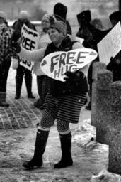 Keywords: blackandwhite black white bw monochrome woman lady girl female sign hug streetphotography downtown kelowna okanagan bc britishcolumbia canada winter snow person people