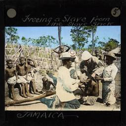 | Keywords: Freeing a Slave from the Slave Stick, Jamaica, ca.1875-ca.1940 (imp-cswc-GB-237-CSWC47-LS11-005).jpg en <br> Freeing a Slave from the Slave Stick Jamaica ca 1875-ca 1940 Freeing a Slave from the Slave Stick Photograph of a man sitting on the ground with a wooden stick across his shoulders A missionary is sawing through the stick Three other men sit around the slave and there is a group of young boys looking on There is a wooden lattice fence behind the boys and the corner of the roof of a thatched hut can be seen to the right of the photograph ; This belongs to a series of Church of Scotland Foreign Missions Committee lantern slides relating to Jamaica In 1800 the Scottish Missionary Society sent three missionaries to Jamaica Two died of yellow fever within weeks of arrival but the third became a pioneer missionary In 1824 a second venture travelled to Jamaica by invitation of local planters to instruct their slaves Scottish missionaries worked at Montego Bay in the 19th century and in 1836 the first presbytery of the Jamaican Church was constituted here Photographer Unknown Filename imp-cswc-GB-237-CSWC47-LS11-005 tif Coverage date circa 1875/1940 Part of collection International Mission Photography Archive ca 1860-ca 1960 Type images Part of subcollection Photographs from the Centre for the Study of World Christianity University of Edinburgh U K ca 1900-ca 1940s Repository name Centre for the Study of World Christianity Archival file impaunpub_Volume7/1780 url Repository address The University of Edinburgh School of Divinity New College Mound Place Edinburgh EH1 2LX United Kingdom Geographic subject country Jamaica Format aacr2 1 lantern slide 8 x 8 cm Geographic subject continent North and Central America Rights Contact the repository for details Part of series Jamaica LS11 Repository email divinity-CSWC ed ac uk Subject lcsh Keyword Slavery; Young men Date created circa 1875/1940 Publisher of the digital version University of Southern California Libraries Subject aat genre group portraits Format aat lantern slides Legacy record ID impa-m69333 Access conditions http //www ed ac uk/schools-departments/divinity/research/centres/world-christianity/collections-resources File GB 237 CSWC47/LS11/5 circa 1875 /1940 date created author http //digitallibrary usc edu/cdm/ref/collection/p15799coll123/id/64897 PD-old-70-1923 Magic lantern images Images from USC Digital Library uploaded by Fæ International Mission Photography Archive ca 1860-ca 1960 Slaves History of Jamaica |