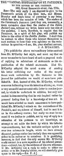 | Keywords: Freeman's Journal 28 January 1863 Letter to the Editor by J. J. McCarthy and its Response.png Letter to the editor by J J McCarthy demanding the publication of his letter to the Dublin Builder which was commented upon in the Freeman's Journal and its response by the editor John Gray Published on p 3 of the Freeman's Journal of 28 January 1863 Scan downloaded from the collection British Newspapers 1600 “1900 of Gale 1863-01-28 J J McCarthy and Sir John Gray PD-old-100 Transcription THE VANDAL RESTORERS OF ST PATRICK'S <br/> <small>TO THE EDITOR OF THE FREEMAN </small><br/> 183 Great Brunswick-street Jan 27th Sir ”The only reply I am disposed to give to the Freeman's article of the 23rd inst and Messrs Murphy and Son's letter of yesterday is my letter which has been the occasion of both The readers of the Freeman's Journal and they are necessarily a more extensive class than the readers of the Dublin Builder can without my letter know only one side of the question I have therefore to request that the Freeman in a spirit of fair play will publish my letter to the editor of the Dublin Builder I shall then be content to allow those who interest themselves in such matters to form their own opinions on the restorations in question ”I am Sir your obedient servant J J M'CARTHY We publish the above extraordinary letter received from Mr M'Carthy last night and must say that we never remember to have heard of such a proposed mode of replying to refutations of statements as the republication of the refuted statements Had Mr M'Carthy adopted the usual course of sending his letter criticising our notice of the magnificent work undertaken by Mr Guinness to this journal for publication we would at once have published it But instead of this Mr M'Carthy without ever even intimating to us his intention of doing so wrote a very uncandid and unsustainable letter to another journal in which he undertool to criticise but only succeeded in demonstrating that he was inspired rather by personal feeling than by knowledge of true art It would have afforded us much amusement to have published Mr M'Carthy's attack on the restorations of St Patrick's and experience of himself had he sent it to us in the ordinary course; but really we must be excused if we decline to publish not by way of a reply to a refutation of his pretence to art knowledge an attempt to set aside the facts by which his fallacies were overthrown but the veritable antique epistle of over two columns in length which we have already dissected perhaps rather less tenderly that was agreeable either to its author or to ourselves It is gratifying however to find that the only answer Mr M'Carthy could concoct is a mere repetition of his refuted pretensions ”refuted too by the evidence of his own witnesses If Mr M'Carthy has a reply to make to either our article or to Mr Murphy's letter we will cheerfully give space to his reply ”Ed F J J J McCarthy Restoration of St Patrick's Cathedral Dublin 1860 “1865 1863 newspapers Letters to the editor |