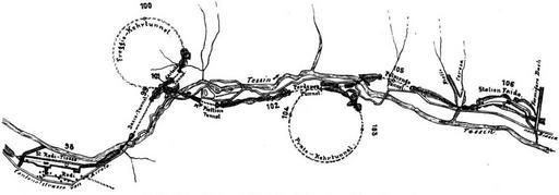 | Keywords: FreggioAndPratoSpiralTunnelsBetweenRodi-FiessoAndFaidoStationsOnSouthernRampToGotthardTunnel.jpg Gotthard Line Gotthardbahn after the Gotthard Rail Tunnel Gotthard Tunnel the line passes the station of Rodi-Fiesso in a 90° left turn crosses to the left side of the Ticino River Tessin valley There it passes the 270° Freggio Spiral Tunnel in a left turn into the left side of the valley Leaving the tunnel the line crosses again the Ticino River valley to proceed a kilometer on the right valley side before moving through the 360° Prato Spiral Tunnel in a right turn into the right valley side Exiting the tunnel the line crosses again to the left valley side bridging smaller streams before passing through the Faido station and continuing the decent down the southern ramp <br> From Rodi-Fiesso at 945 m to Faido at 758 m the line drops 187 m along 8 2 km of tracks with 26 ° being the sharpest decline in this section The shortest beeline distance between the stations is approximately 4km I e the average decline was reduced by approximately 50 reducing the power needed by the locomotives for the climb The elevation data and inclination data were all taken from the figure Profile of the Gotthardbahn Gotthardbahn in Röll V Freiherr von Enzyklopädie des Eisenbahnwesens Band 5 Berlin Wien 1914 p 356 and 357 digitized version on www zeno org/Roell-1912 http //www hls-dhs-dss ch/textes/d/D3061 php Dietler Hermann 1839-10-01 - 1924-01-24 ; Röll Victor Freiherr von 1852-05-22 - 1922-10-12 1914 book or prior source predating the publication of volume 5 of Röll's encyclopedia in 1914 PD-old-80 The original German caption of the graph in the cited publication reads Abb 290 Linienentwicklung bei Dazio Grande Ferggio- und Prato-Kehrtunnel <br> No scale or legend was provided with the map other than the travel distance along the Gotthard line from Immensee indicated for each full kilometer by a small circular mark and the specified distance in km A hight information is also not provided <br> Some of the notations on the map are hard to resolve and prone to be misread or misinterpreted This includes but is not limited to the two station names and the name of one of the spiral tunnels which are the more prominent features marked in larger letter type compared to others Here the correct name is used with a possible misinterpretation shown in brackets and in the case of the two stations their travel distance from Immensee as interpreted from the data provided in the map <br> Rodi-Fiesso Station Rodi-Tiesso 97 8km <br> Faido Station F ido 106 0km <br> Prato Kehrtunnel Prxte Kehrtunnel <br> These distances match the ones currently listed for the stations in the route diagramm of the Gotthardbahn Tessin is the Ticino River PD-old Historical images of the Gotthardbahn Gotthard rail tunnel Rail transport maps of Switzerland History of rail transport in Switzerland Ticino river Images from zeno org |