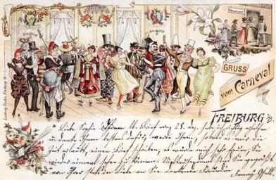 | Keywords: Freiburg AK Carneval 1899.jpg Freiburg im Breisgau Gruss vom Carneval Ansichtskarte versandt 1899 Verlag Ludwig Fuchs Freiburg i/B Lebensdaten nicht feststellbar “ Motiv Maskenball rechts nach dem Karneval zum Versatzamt Pfandleiher Wulf Wager Schwäbisch-alemannische Fasnet in alten Bildern Stuttgart 2003 ISBN 3-87407-568-0 by 1899 Ludwig Fuchs Verlag oder auch Künstler PD-old-70-1923 History of Carnival Fasnet in Freiburg History of Freiburg im Breisgau 1899 postcards Balls dance in art Pawnbrokers in Germany |