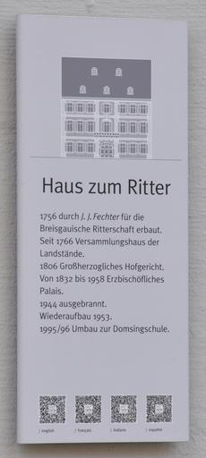| Keywords: Freiburg Haus zum Ritter 04.jpg Freiburg im Breisgau Münsterplatz Haus zum Ritter heute Domsingschule Informationstafel own own photograph 2015-06 Photo Andreas Praefcke FoP-Germany Photos by User AndreasPraefcke Haus zum Ritter Freiburg im Breisgau Plaques in Freiburg im Breisgau |