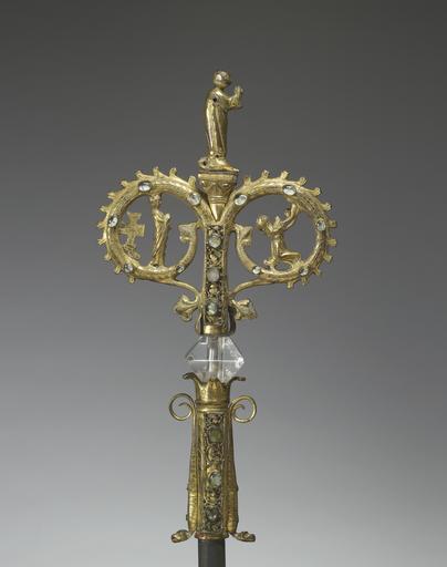 | Keywords: French - Choirmaster's Crozier with Saints Valerie, Martial, and Michael - Walters 5383 - Back.jpg This unusual crozier branches into two volutes containing on one side St Valerie kneeling with her decapitated head guided by a small angel St Martial the bishop who converted her to Christianity is seen on the other side celebrating the Mass At the top is the archangel St Michael; all three were patron saints of Limoges Made for a choirmaster this crozier's two volutes symbolize the two parts of the chants verses and responses that were traditionally sung by a choir of monks middle Other date century 13 Medieval gilded copper with rock crystal and semiprecious stones cm 32 8 16 2 3 accession number 53 83 37370 Dugué Paris before 1847 Sale Paris March 7 1851 no 2 Hollingworth Magniac Colworth Bedford 1851 by purchase Charles Magniac Colworth 1867 by inheritance Sale Christie's London July 2 1892 no 504 Edward Arnold London by purchase Sale London June 8 1920 no 183 Webb George Robinson Harding London by purchase Henry Walters city Baltimore Walters Art Museum Henry Walters Acquired by Henry Walters 1920 Vive la France French Treasures from the Middle Ages to Monet The Walters Art Gallery Baltimore 1999-2000 place of origin Limoges France Walters Art Museum license Medieval metalwork in the Walters Art Museum Champlevé of Europe Art of France in the Walters Art Museum Croziers Media contributed by the Walters Art Museum needs category review Vive la France French Treasures from the Middle Ages to Monet |