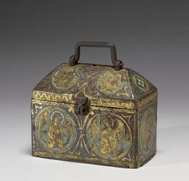 | Keywords: French - Chrismatory - Walters 44102 - Three Quarter.jpg A chrismatory served as a container for the three vials of holy oil or chrism used in church rites These were the oil for the consecration of priests and churches the oil for confirmation of the young and the oil for the last rites of the dying This chrismatory decorated with engraved busts of angels would have been supported by gilded copper feet middle Other date century 13 Medieval champlevé enamel on copper with gilding cm 11 10 9 7 1 H with handle down cm 9 6 accession number 44 102 5063 Henry Walters Baltimore date of acquisition unknown by purchase Walters Art Museum Henry Walters Acquired by Henry Walters place of origin Limoges France Walters Art Museum license Medieval metalwork in the Walters Art Museum Art of France in the Walters Art Museum Media contributed by the Walters Art Museum needs category review Limoges champlevé |