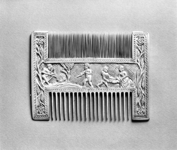 | Keywords: French - Comb with Secular Scenes - Walters 71266 - Reverse.jpg The comb which has floral terminals has on one side a scene of a man and seated woman preparing to play kick foot in a tilt yard as spectators watch from behind the railing On the reverse are two scenes On the left two nude boys one with a bow and the other with a hand cannon shoot at a sitting duck On the right a youth pulls off the stocking of a seated woman The scenes are set against a coarsely crosshatched ground The small and large teeth have all been replaced by sections inset into the frame between 1490 1500 Renaissance ivory cm 11 2 15 accession number 71 266 29026 Countess Petronio Collection date and mode of acquisition unknown Sale Paris June 24 1921 lot 58 H Wareham Harding New York date and mode of acquistion unknown Henry Walters city Baltimore Walters Art Museum Henry Walters Acquired by Henry Walters 1921 Illuminated Manuscripts Masterpieces in Miniature The Walters Art Gallery Baltimore 1984-1985 Medieval Games of Love and War The Walters Art Gallery Baltimore 1995-1996 Romance of the Rose Visions of Love in Illuminated Medieval Manuscripts The Walters Art Museum Baltimore 2009 place of origin France Walters Art Museum license Renaissance applied arts in the Walters Art Museum Art of France in the Walters Art Museum Historic Combs Media contributed by the Walters Art Museum needs category review |