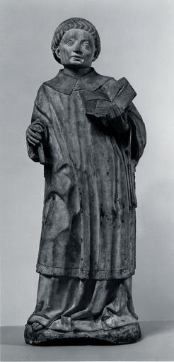 | Keywords: French - Deacon Holding a Book - Walters 27437.jpg This deacon identified by his collar and tunic from the order of clergy just below the priest holds an open Gospel book from which he would have read aloud during mass The statue may represent the deacon Eleutherius companion of St Denis; they were martyred together near Paris about 275 We cannot make out the shape of his body under the heavy cloth-as one might in an Italian statue-but the swaying lines of the folds and the tilt of the man's head indicate that his weight is on his left leg a graceful natural stance This is complemented by realistic details such as his bare toes Originally the statue was painted enhancing the naturalistic impression between 1440 1470 limestone with traces of paint cm 75 26 19 5 accession number 27 437 8097 Henry Walters Baltimore date and mode of acquisition unknown Walters Art Museum Henry Walters Acquired by Henry Walters Religious Art of the Western World Dallas Museum of Art Dallas 1958 Illuminated Manuscripts Masterpieces in Miniature The Walters Art Gallery Baltimore 1984-1985 place of origin France Walters Art Museum license Renaissance sculpture in the Walters Art Museum Art of France in the Walters Art Museum Media contributed by the Walters Art Museum needs category review |