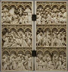 | Keywords: French - Diptych with Scenes from the Passion of Christ - Walters 71179 - Open.jpg By the middle of the 14th century the ivory workshops of Paris were creating large-scale diptychs two hinged panels with numerous scenes from the Passion cycle Thirteen are found here reading from top to bottom and left to right Christ's Entry into Jerusalem the Washing of the Feet the Last Supper the Garden of Gethsemane the Arrest of Christ the Hanging of Judas the Flagellation of Christ Christ bearing the Cross to Calvary the Crucifixion the Deposition Entombment Christ appearing to Mary Noli me tangere and Christ's Descent into Limbo Notably Parisian in style are the slender figures with their swayed elegant poses and smooth drapery folds Diptychs were used as aids in prayer by the wealthy owners who commissioned them between 1350 1365 Medieval ivory with traces of paint and gilding cm 25 23 2 1 accession number 71 179 25829 Listed in an inventory dated 1430 of the Treasury of the Cathedral of Vich Catalonia Museum at Vich Spain until 1903 Henry Walters Baltimore date of acquisition unknown by purchase Walters Art Museum Henry Walters Acquired by Henry Walters The International Style The Arts in Europe Around 1400 The Walters Art Gallery Baltimore 1962 Ivory The Sumptuous Art The Walters Art Gallery Baltimore 1983-1984 Images in Ivory Precious Objects of the Gothic Age The Detroit Institute of Arts Detroit; The Walters Art Gallery Baltimore 1997 place of origin Paris France Walters Art Museum license Medieval ivory in the Walters Art Museum Art of France in the Walters Art Museum Media contributed by the Walters Art Museum needs category review |